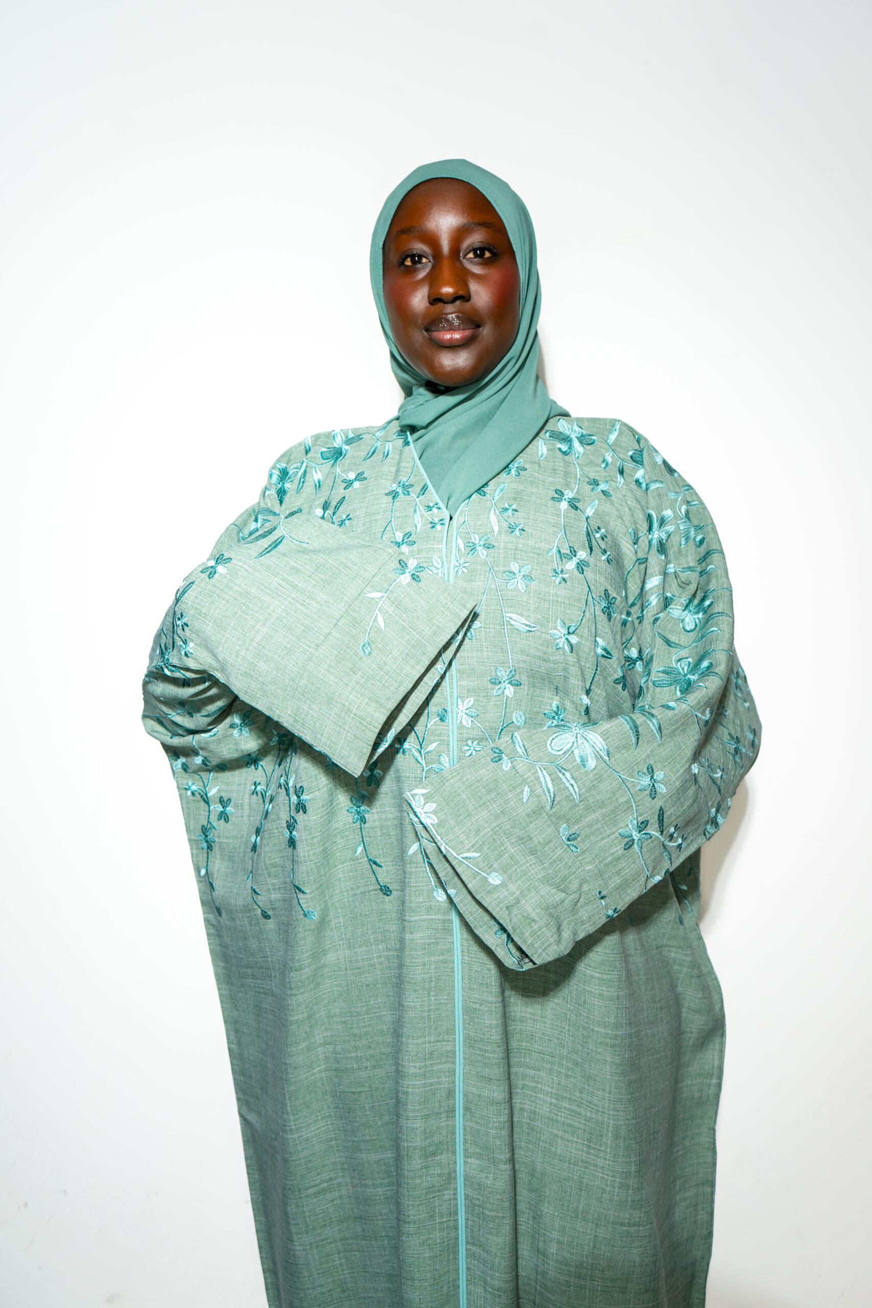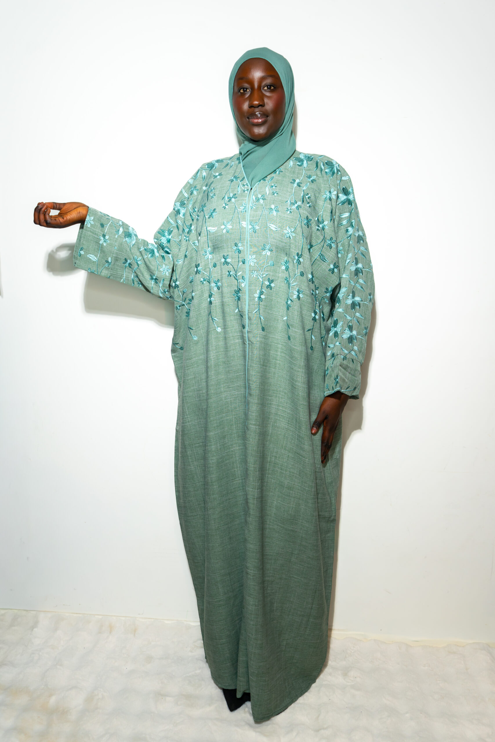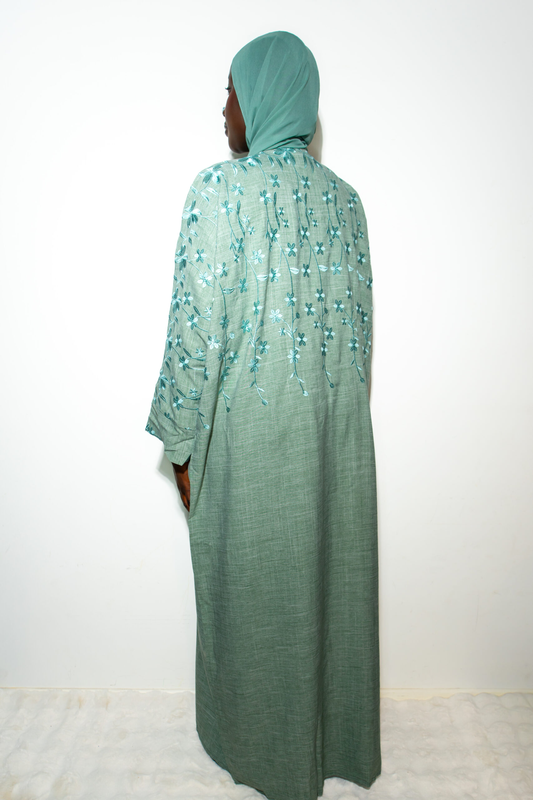 Abaya vert sauge avec broderies florales ton sur ton, offrant un style raffiné et intemporel. Sa coupe fluide met en valeur toutes les silhouettes tout en assurant un grand confort.